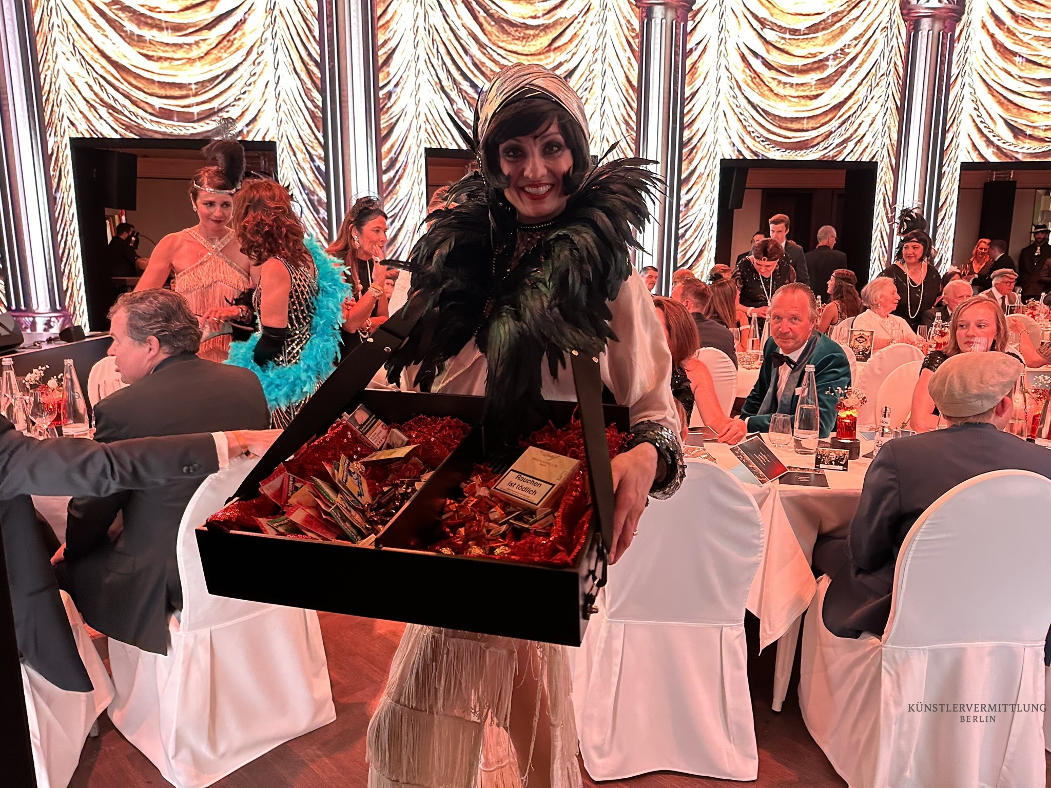 Lassen Sie sich von unseren Bauchladendamen in die glitzernde Atmosphäre des Varietés entführen – direkt aus dem Berlin der 1920er!