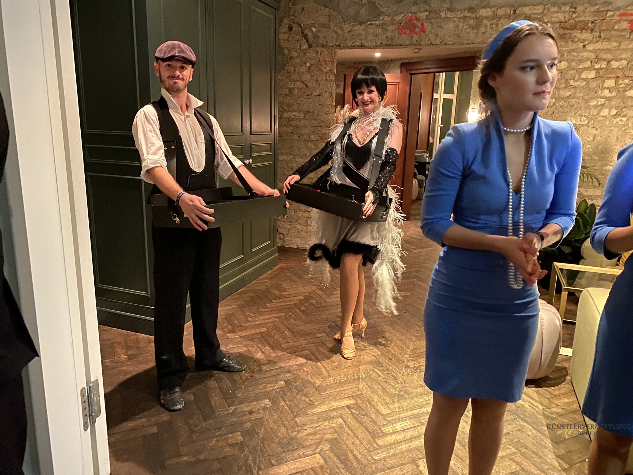 Aus ihren liebevoll dekorierten Bauchläden bieten sie Pralinen, Zigarren, Rosen, Give-aways oder Champagnerflacons an – immer charmant, immer im perfekten Gatsby-Look.